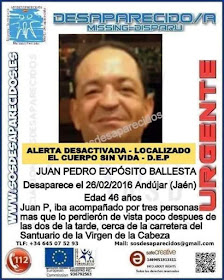 Juan Pedro Expósito, vecino de Andújar de 46 años, desapareció el pasado 26 de febrero cuando salió a recoger espárragos. Hasta un centenar de personas participaron, durante la primera semana de la desaparición, en la búsqueda del vecino de Andújar y al que se seguía activa pero con mucha menos intensidad. Una veintena de agentes de Seguridad Ciudadana y el Servicio de Protección de la Naturaleza (Seprona), tanto de la patrulla de Andújar como con refuerzo desde la Comandancia jiennense, fueron los que mantuvieron las labores de búsqueda sobre el terreno, una vez que se retiraron otras unidades que participaron en el rastreo.