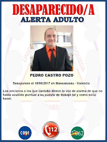Un vecino de Massanassa, Pedro Castro Pozo, también conocido cariñosamente como 'el martillo', se encuentra desaparecido desde el pasado lunes día 19 de junio, cuando los ancianos a los que cuidaba dieron la voz de alarma de que no había acudido puntual a su puesto de trabajo tal y como solía hacer. Según han informado fuentes familiares, el móvil del desaparecido se encuentra apagado, y ni su familia en Massanassa ni la que también conserva en la provincia de Girona sabe nada de él.